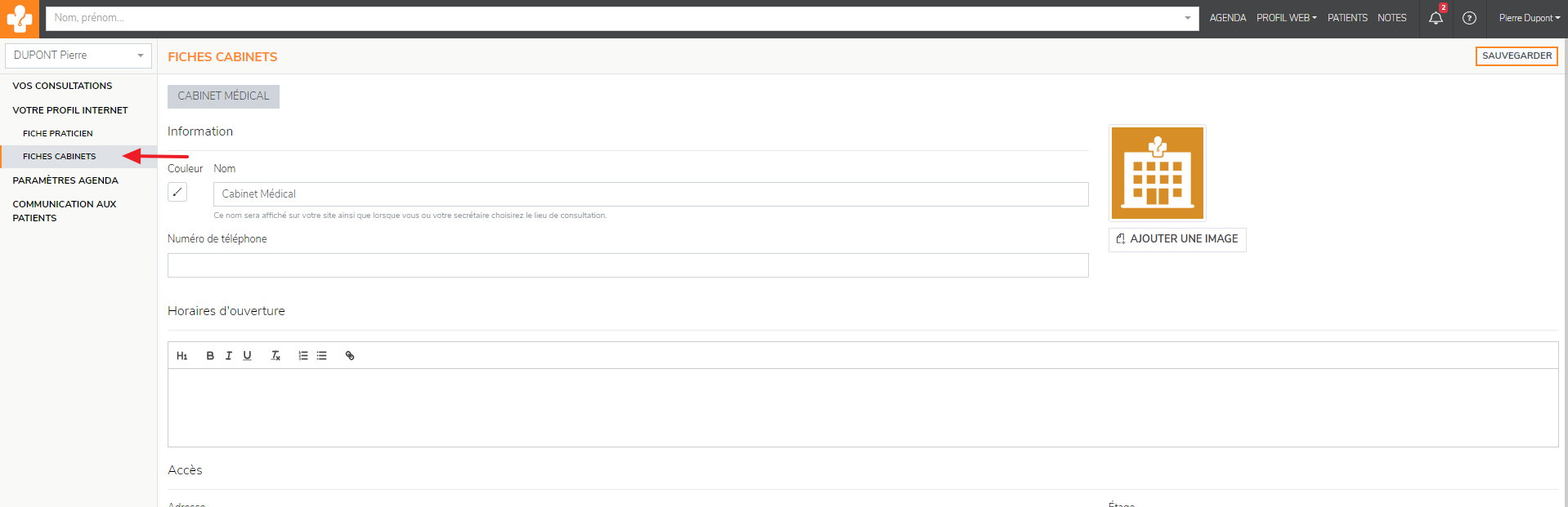 Vous retrouverez deux onglets dans vos paramètres pour renseigner vos informations (praticien et cabinet).
