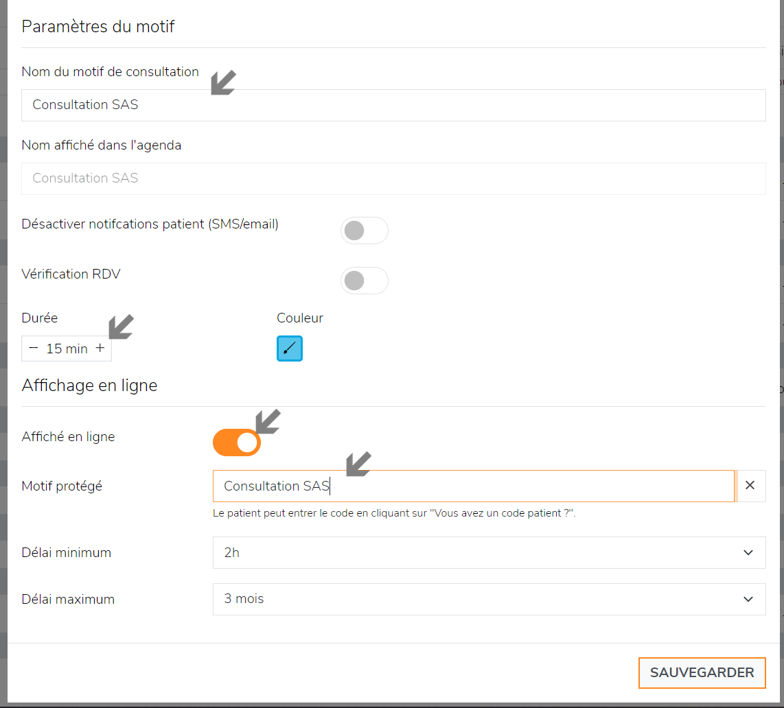 * La mention renseignée n'est pas à communiquer au SAS, elle permet de ne pas faire afficher ce motif pour vos patients et le faire automatiquement apparaitre aux opérateurs du SAS.