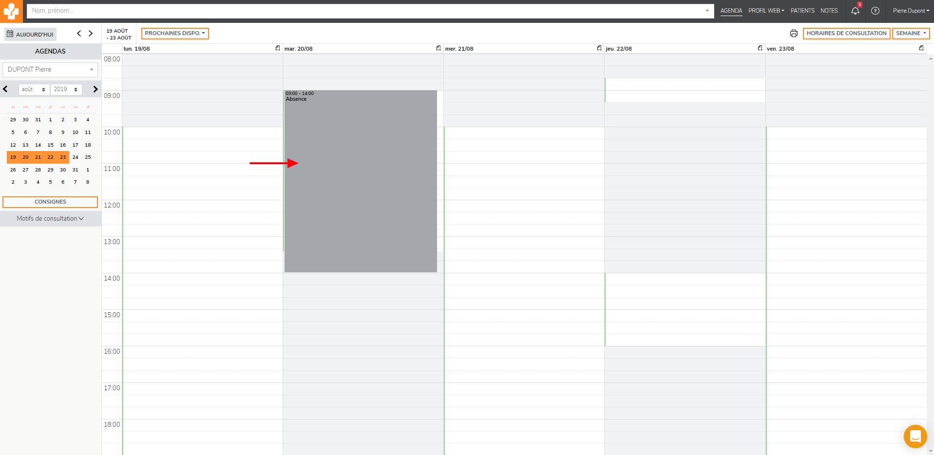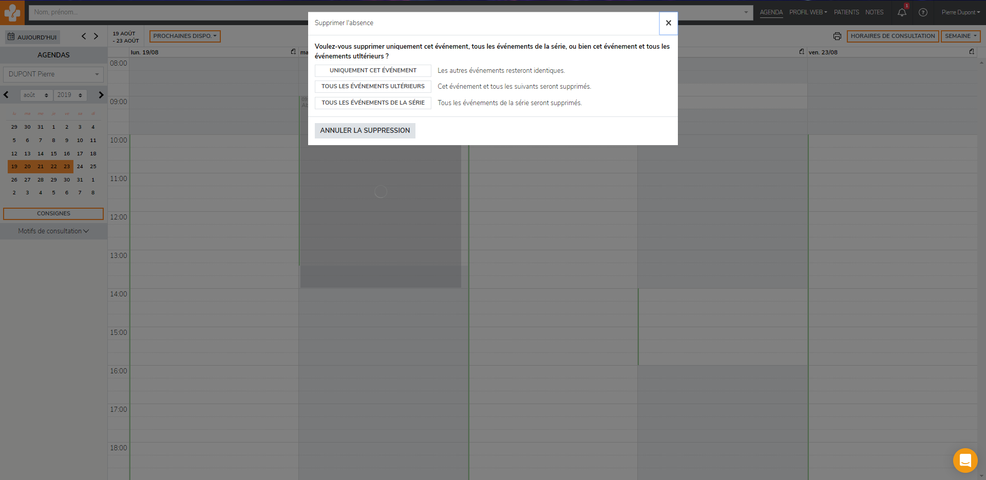 Pour annuler une absence récurrente, il vous suffit de cliquez sur l’absence à annuler.