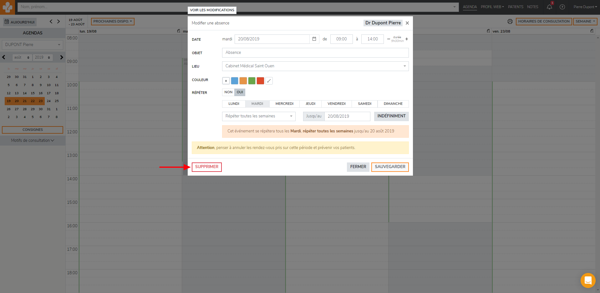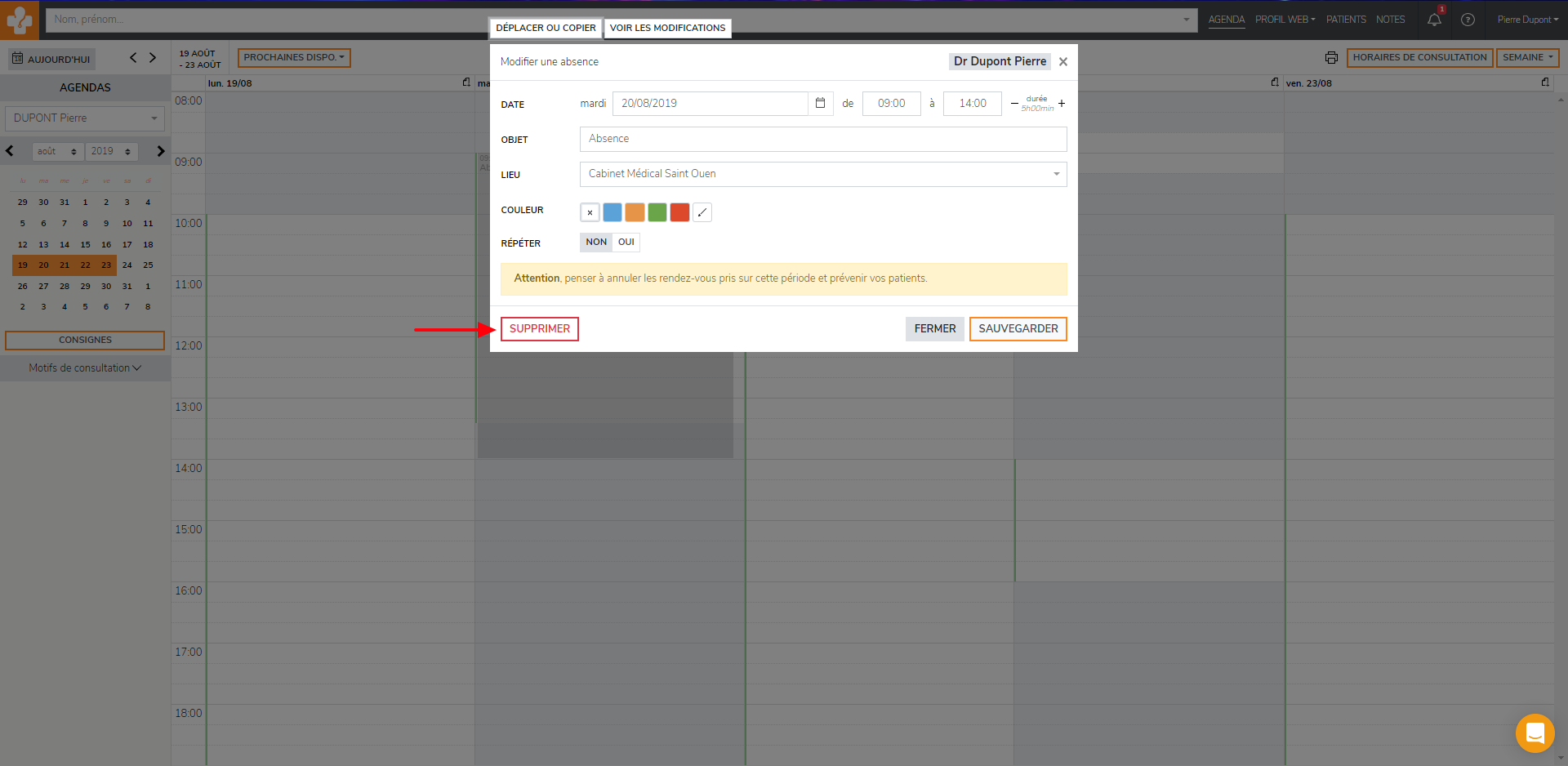 Cliquez sur « Supprimer » afin que l'absence soit annulée.