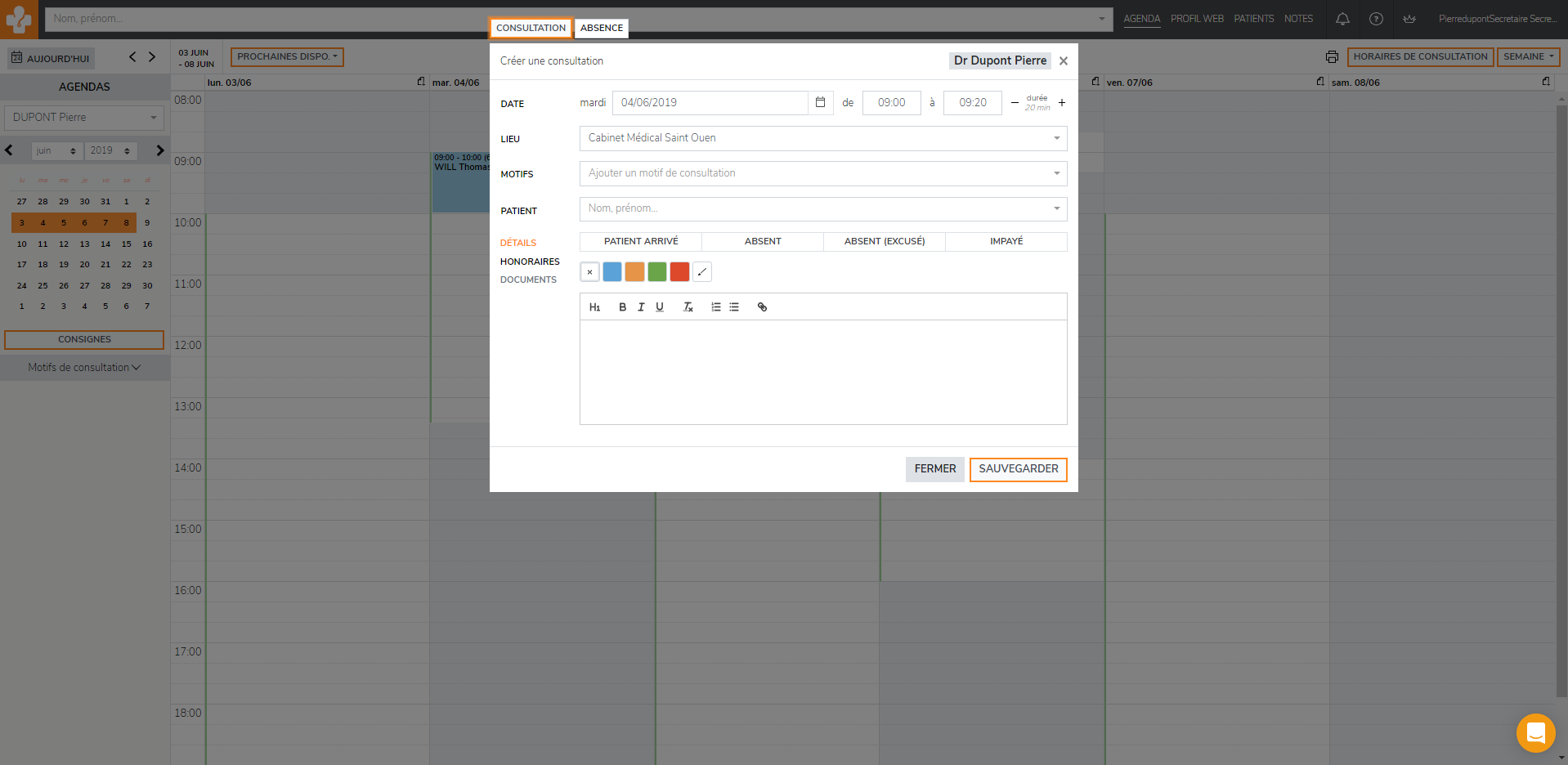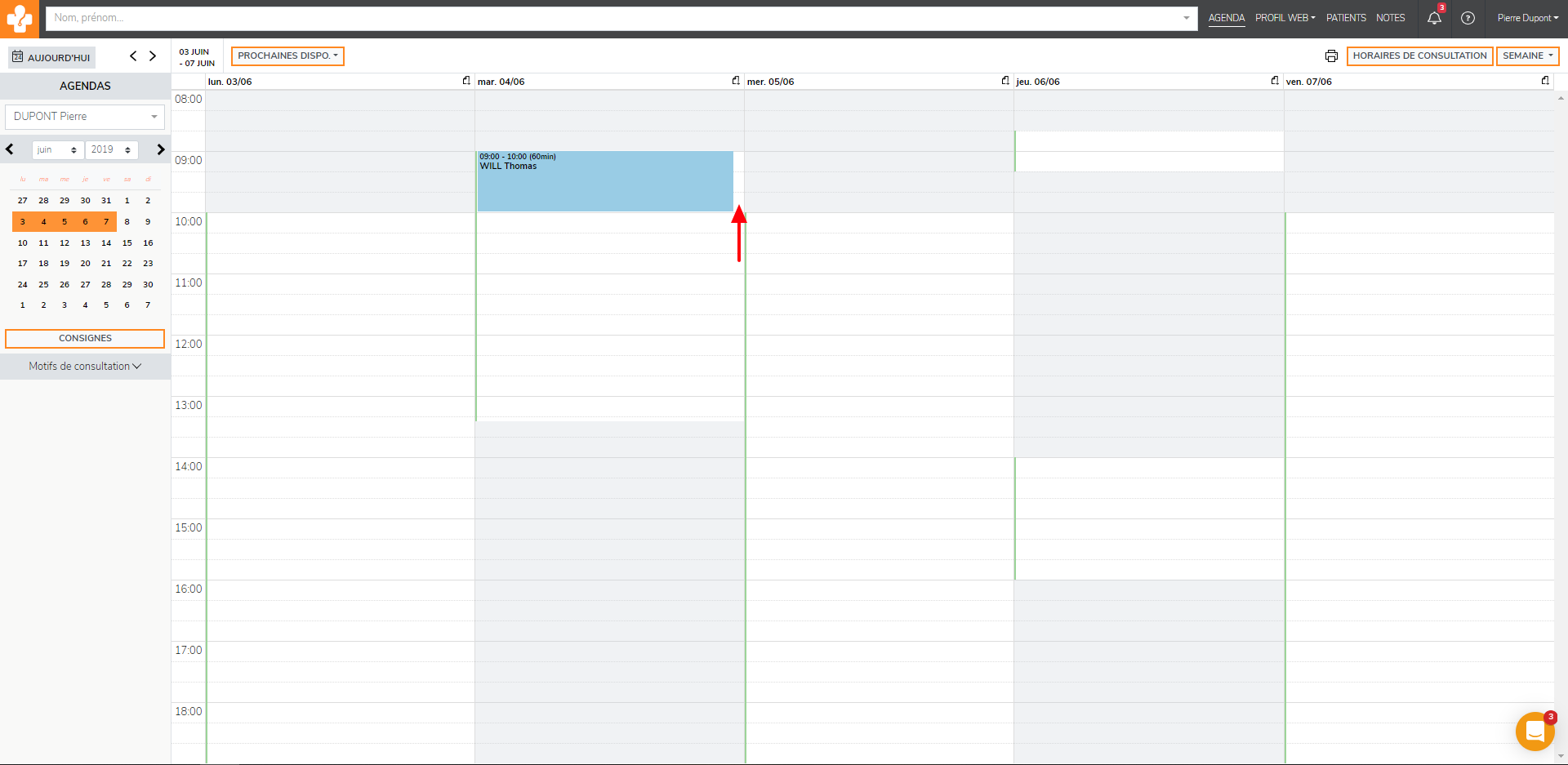 Pour cela, il vous suffit de sélectionnez le compte du praticien puis de cliquez sur l’intervalle entre le rendez-vous déjà pris et la limite de la journée.