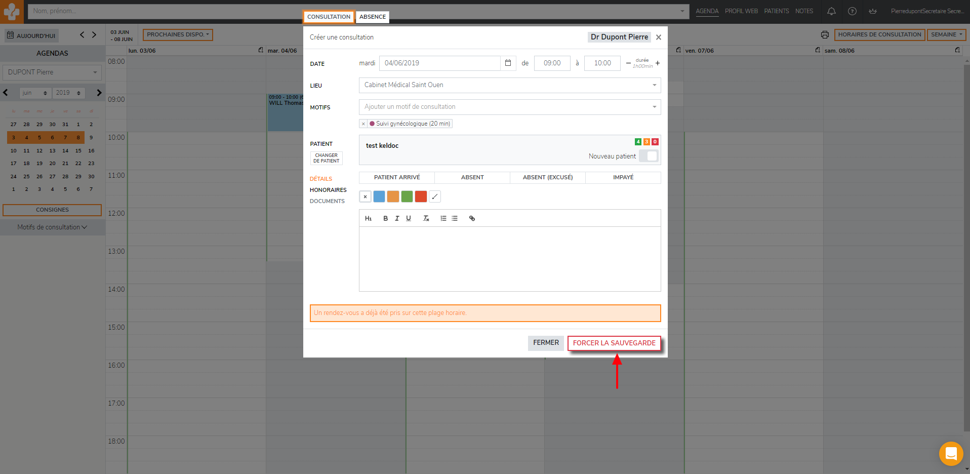 Si le message d’alerte en cas de surbooking est activé, vous serez notifié lors de la création du doublon de rendez-vous. Cliquez sur « forcer la création» afin de créer le rendez-vous.