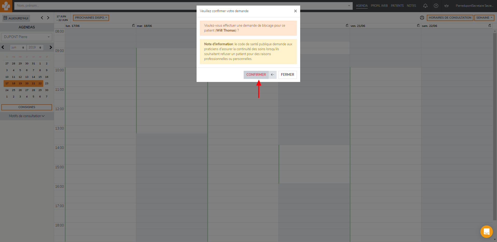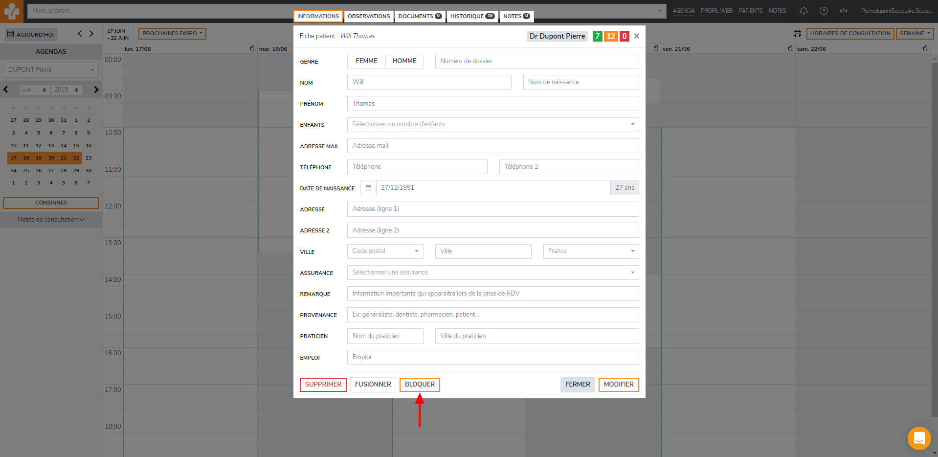 La fiche patient apparaît. Cliquez sur « bloquer »