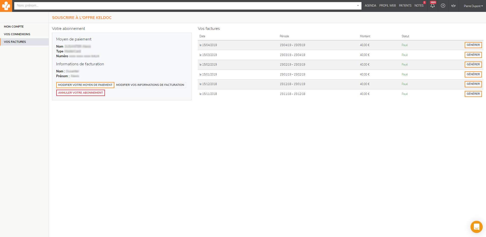 A droite, vous retrouvez l'ensemble de vos factures avec la possibilité de les télécharger en cliquant sur Générer.