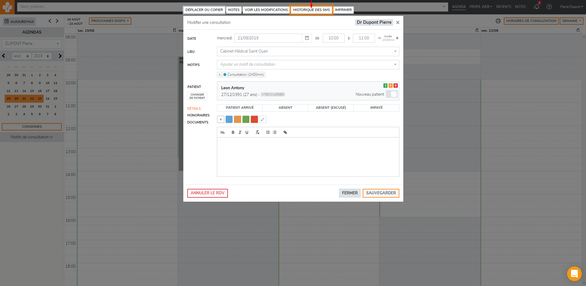La fenêtre du rendez-vous s'ouvre, cliquez sur « Historique des SMS »