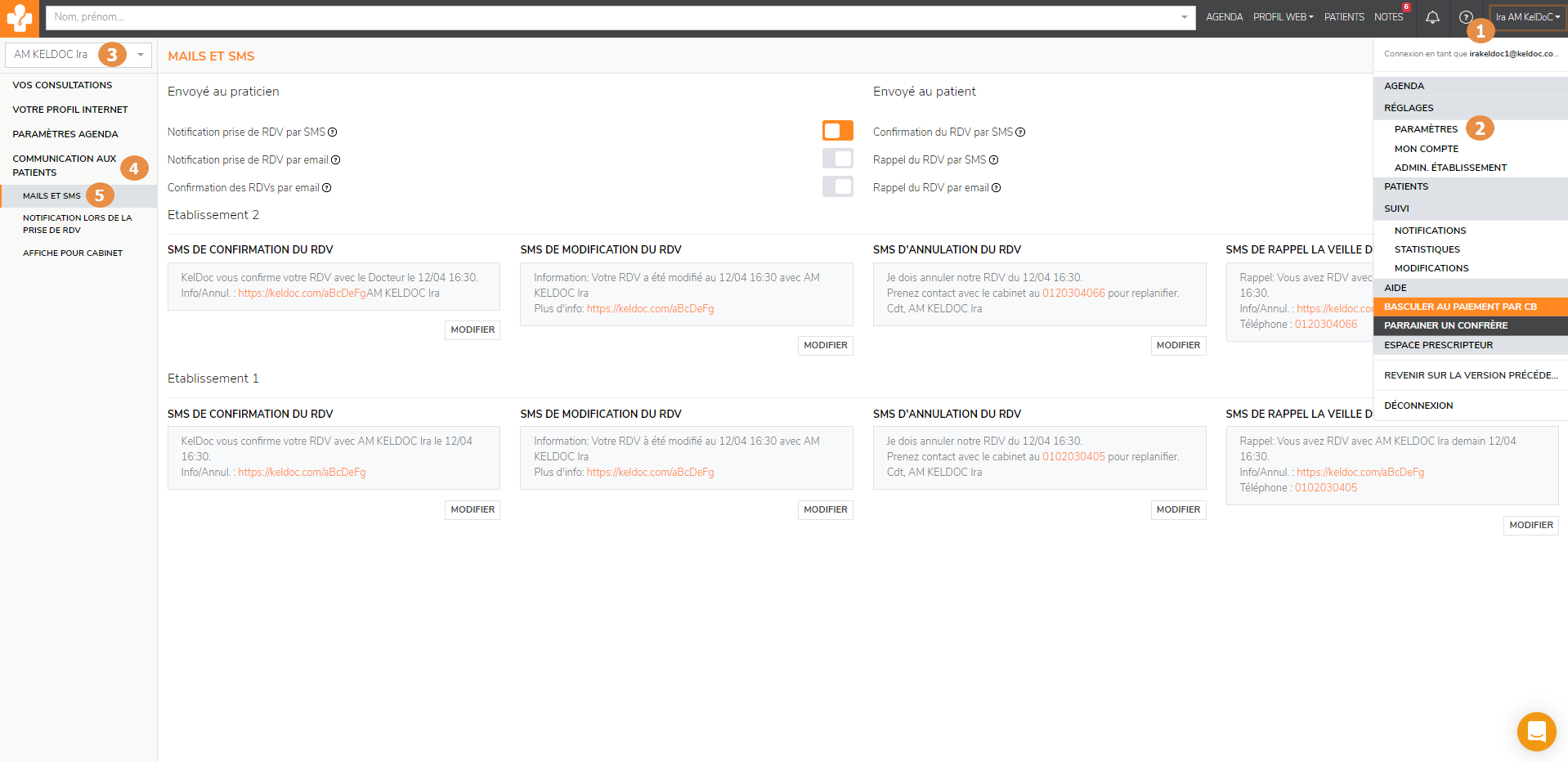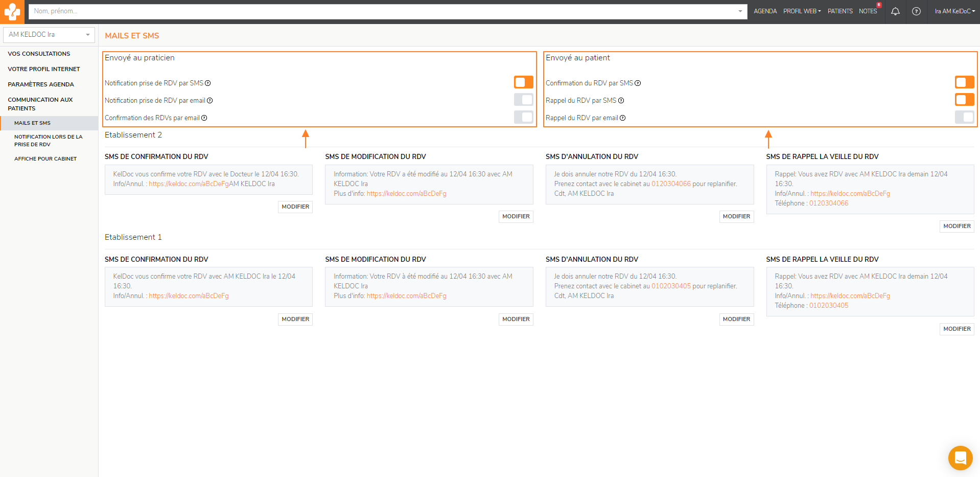 Vous pouvez activer/désactiver les mails et SMS qui vous sont envoyés, ainsi que pour vos patients.